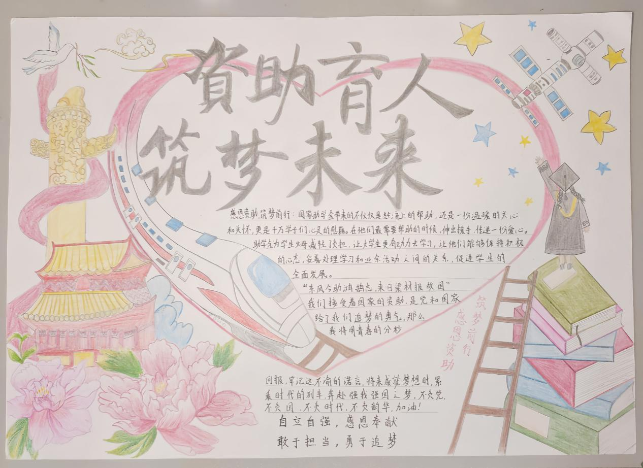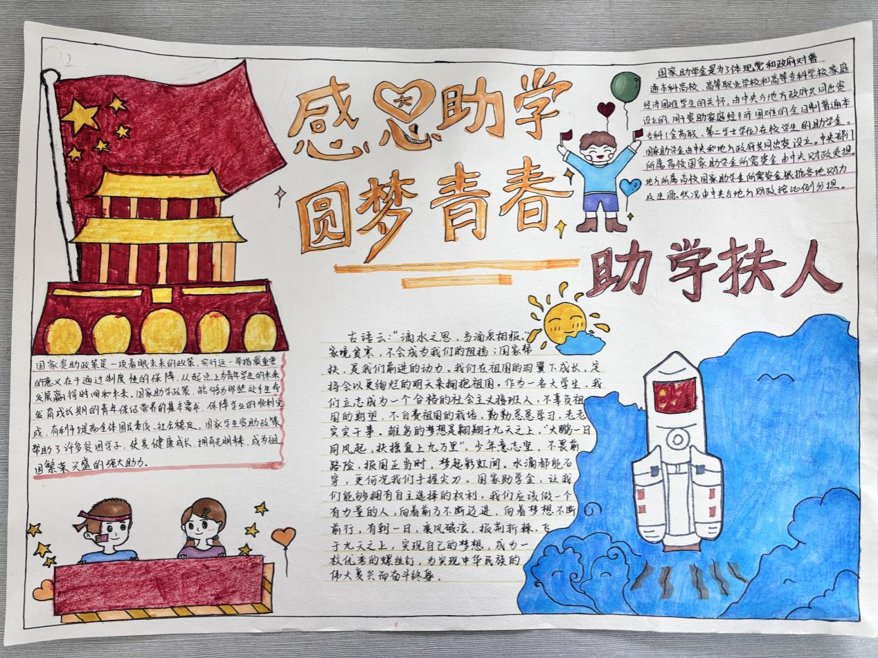 学院将资助宣传活动与手抄报大赛相结合,加深了同学们对国家资助政策的认识,促使同学们养成自立自强、奋发图强的良好品质,增强同学们的感恩意识和爱国情怀,促进他们的社会责任感。