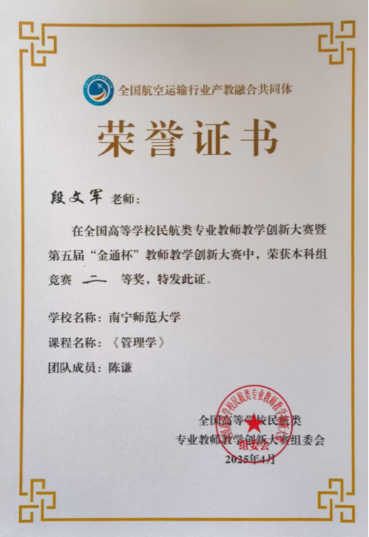 4月23-25日,由中国交通教育研究会职业教育分会、全国航空运输行业产教融合共同体、北京广慧金通教育集团主办的全国高等学校民航类专业教师教学创新大赛暨第五届“金通杯”教师教学创新大赛决赛在山东曲阜成功举办。本次大赛包括本科、高职两条赛道,经过网络评审,层层选拔,全国共有31支优秀教师团队入围总决赛。在现场总决赛中,167net必赢入口派出的167net必赢入口段文军、陈谦老师团队荣获本科组二等奖。