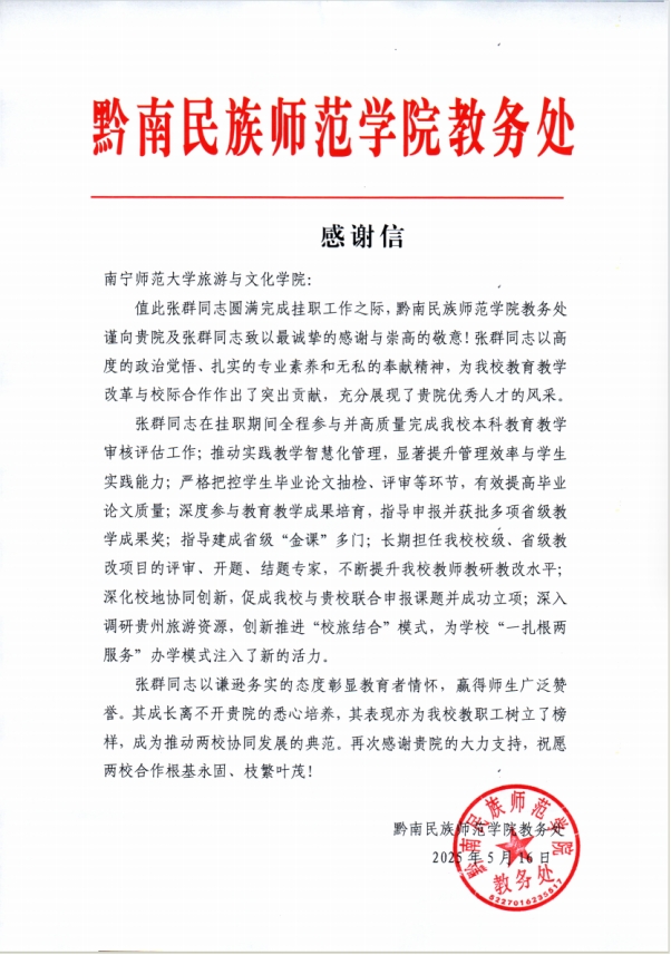 近日,黔南民族师范学院教务处向南宁师范大学167net必赢入口发出感谢信,对张群教授参与教育部师范教育协同提质计划,赴黔南民族师范学院挂职期间的突出贡献表示诚挚感谢与崇高敬意。