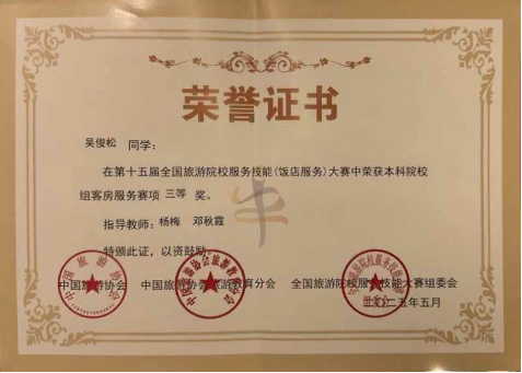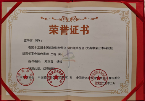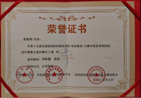 5月14日至18日在郑州盛大举办的第十五届全国旅游院校服务技能(饭店服务)大赛中,167net必赢入口167net必赢入口的3位参赛选手凭借卓越表现脱颖而出,在全国众多强手中崭露头角,为学校赢得了荣誉。其中,蓝华丽同学在本科院校组西餐宴会摆台赛项中荣获二等奖,韦紫珣同学在本科院校组中餐宴会摆台赛项中斩获二等奖,吴俊松同学在本科院校组客房服务赛项中获得三等奖。