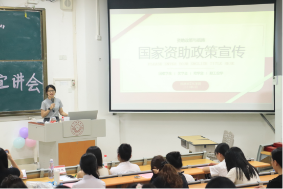 接着,资助工作何滩老师以 “让每一份资助都成为追梦的翅膀” 为核心,开展系统政策宣讲。她以近三年学院资助数据为切入点,详细解读国家奖学金、国家助学金、生源地信用助学贷款等 7 类政策的申请条件、评审流程及发放标准。何滩老师结合具体案例逐条解析,并特别强调 “资助不仅是经济支持,更是培养感恩意识与责任担当的育人载体”。她向全体受助学生提出三点期望:一是心怀感恩,以优异成绩回馈社会关爱;二是自立自强,在专业学习中锤炼过硬本领;三是勇于担当,以实际行动传递资助温情。