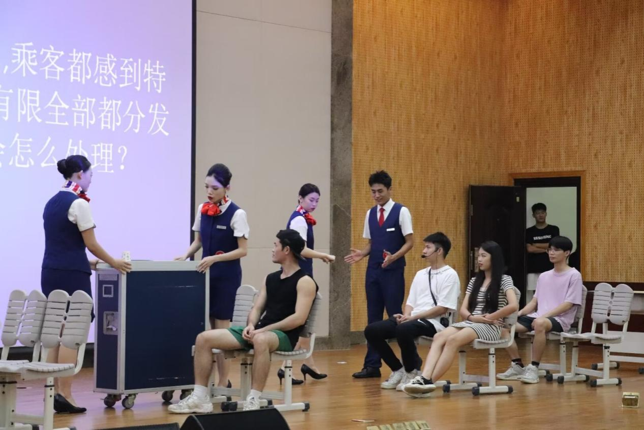 经过初赛严格的选拔,共有七个小组成功晋级决赛。决赛分为四个部分:开场秀(走秀)+自我介绍、民航播音广播词、民航知识答题、模拟客舱。各个乘务组以团体走秀的形式亮相并介绍各自团队名称、口号等信息,团队成员在进行了自我介绍后,根据提供的民航播音广播词抽取题目,进行中文、英文及方言的播读。接着,根据比赛所提供的民航知识题库进行现场抽题答题,各乘务组抽取两名选手进行比赛。最后,选手需要根据不同的场景要求给模拟旅客提供恰当有效的服务方式,这不仅考察选手的应变能力,还高度考验团队合作默契,紧张有序的情景演示将比赛推向高潮。