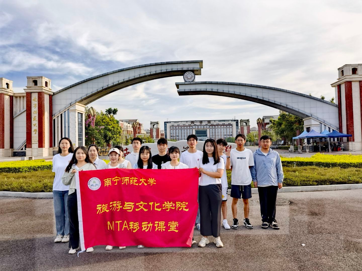 活动伊始,全体成员在武鸣校区标志性拱门前举行了简短的出发仪式。抵达上林大龙湖后,活动进入实践环节。同学们围绕“党建引领乡村振兴”“文旅融合高质量发展”等议题开展现场研讨,将课堂上学到的旅游管理理论与基层实践相结合,深入探讨如何通过党建赋能,推动地方旅游产业发展。